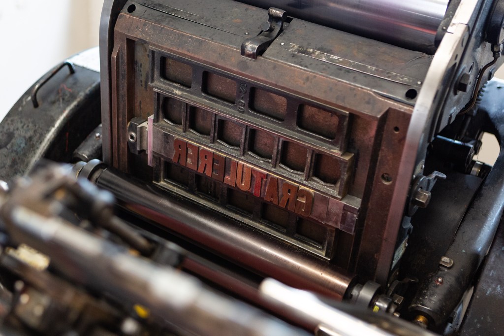 For en godt vant PC-bruker tar det kanskje fem sekunder å åpne et tekstdokument og skrive «Gratulerer». Sleng på ti sekunder til, og du har fargelagt ordet i en vakker gradient og skrevet ut et slags gratulasjonskort. I Petters verden er dette en langt mer omstendelig prosess. Først må han finne en passende skrifttype fra en av de 160 skuffene med bokstaver som hittil er på plass i verkstedet. De ti bokstavene plasseres i en ramme, og mellom ramma og bokstavene fylles det på med metallklosser av ulik størrelse sånn at bokstavtypene sitter dønn fast. Underlaget må være helt i vater, for bokstavene skal ligge eksakt like høyt i ramma. Så monteres ramma i trykkpressa, en Heidelberg platepresse fra 1967 som har gjort tjeneste hos Aas og Sønn boktrykkeri. Petter måler og demonterer ramma igjen. Her må flere metallklosser til for å få ordet på riktig plass. – Et puslespill for voksne, kommenterer Petter.