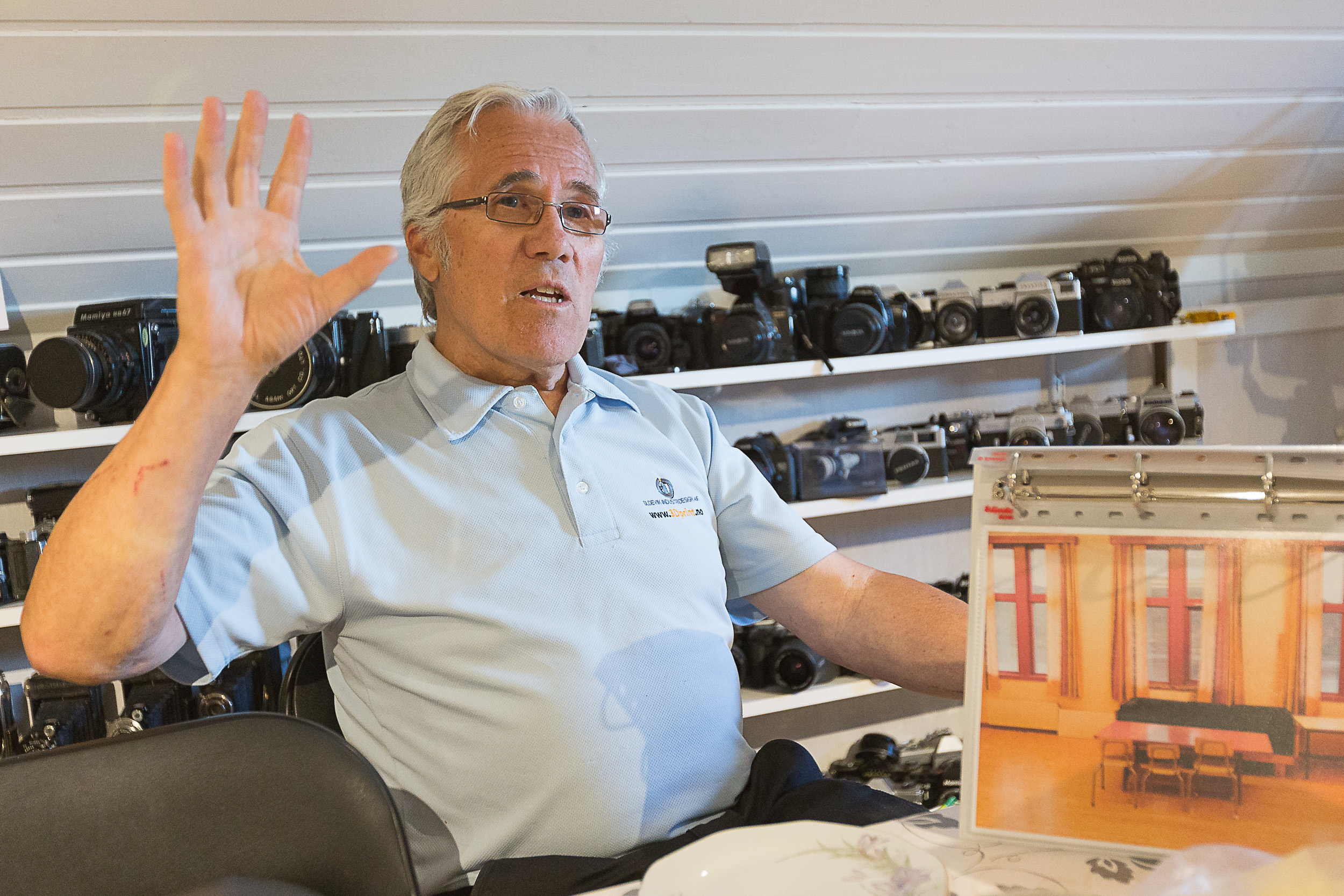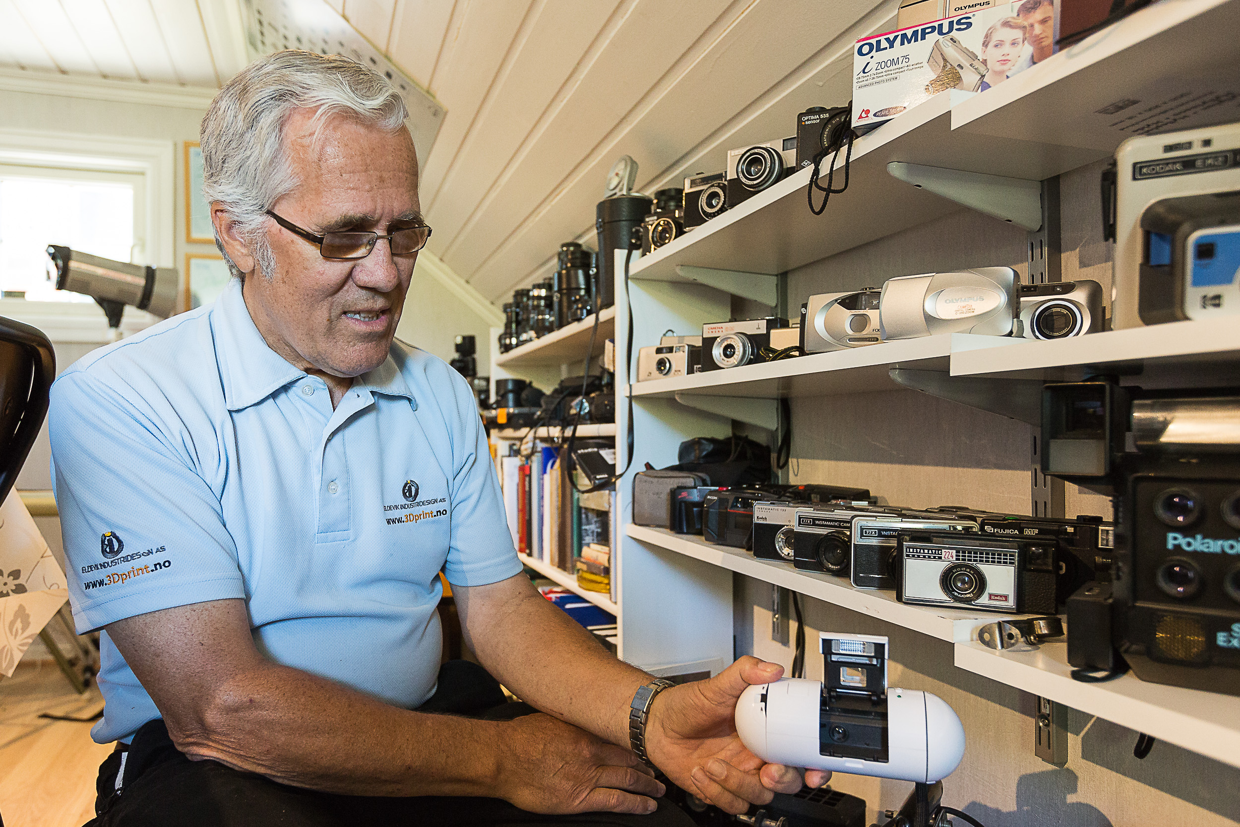 – Et sted mellom 400 og 500, sier Jostein Eldevik (71) og innrømmer at han har ikke helt kontroll på hvor mange fotoapparater han har. Han geleider oss opp trappa til det alarmsikrede rommet over garasjen. Takhøyden der inne er ikke for folk over 180 cm. De lave sideveggene er hyllekledt, og det er knapt en millimeter ledig plass til flere gjenstander. I taket henger forstørrede tegninger som viser den eldste delen av fotografiets historie. Midt på gulvet står et bord med ti stoler rundt. Den lokale fotogjengen har allerede tatt i bruk rommet som møteplass. Jostein har imidlertid lyst til at flere skal få lov til å oppleve samlinga.